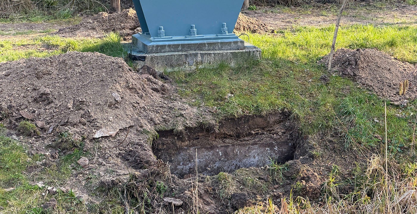 Op die plek is de grond rond een betonpoer weggehaald, waardoor de fundering van de steunpilaar zichtbaar werd. Om de werkzaamheden veilig uit te kunnen voeren is de omgeving volledig afgesloten voor bezoekers, ook liggen er steigers klaar.